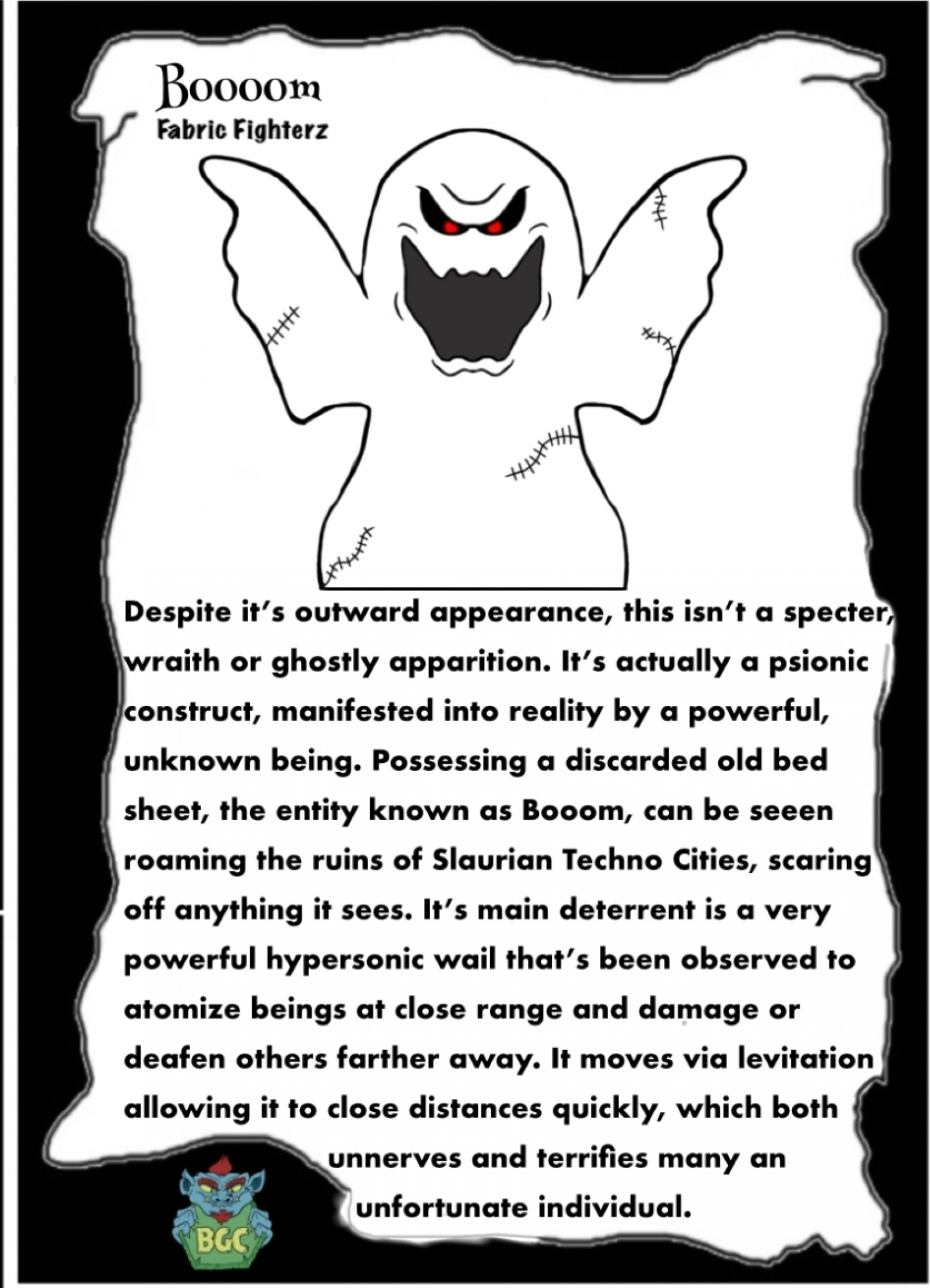 Booom is based on a character I had created back in the 90's for my Creature World story adventures. Back then, it was a robot from off of Slauria and was part of the Sun Strikers team, with a sonic cannon built into its mouth. I was trying to make a bunch of Halloween themed characters, but when I was working on his bio I took the character in a different direction that I like much better.