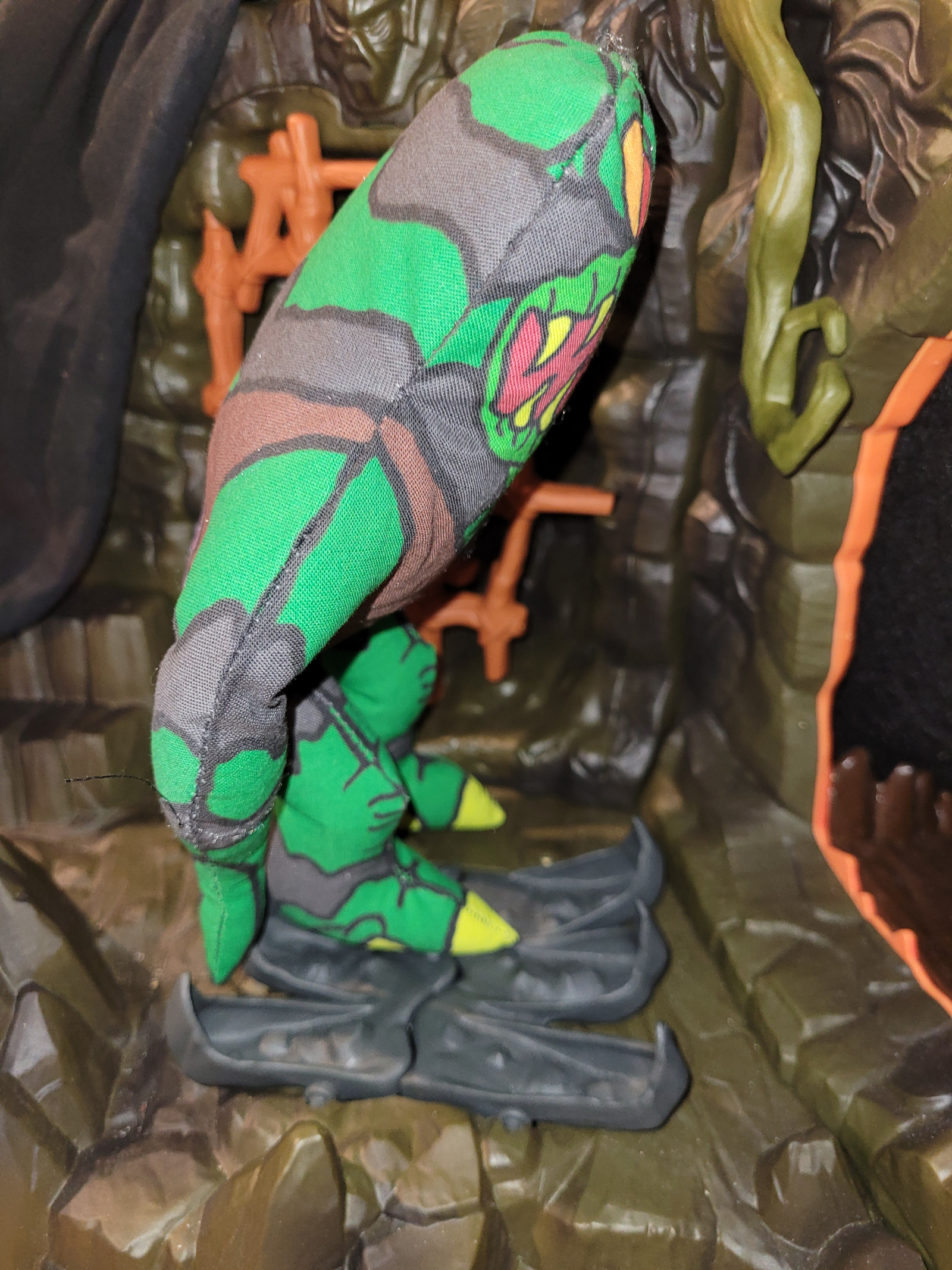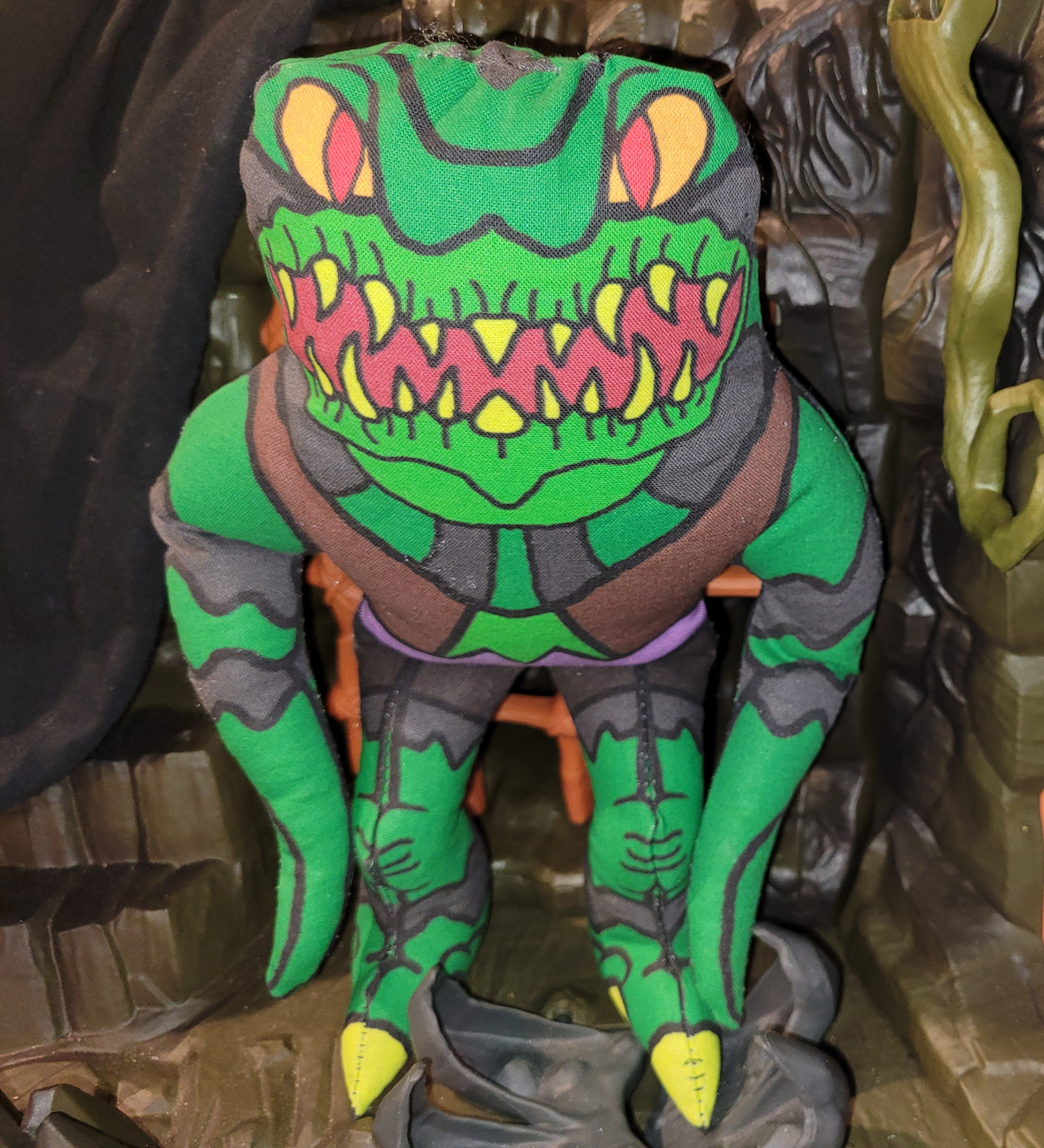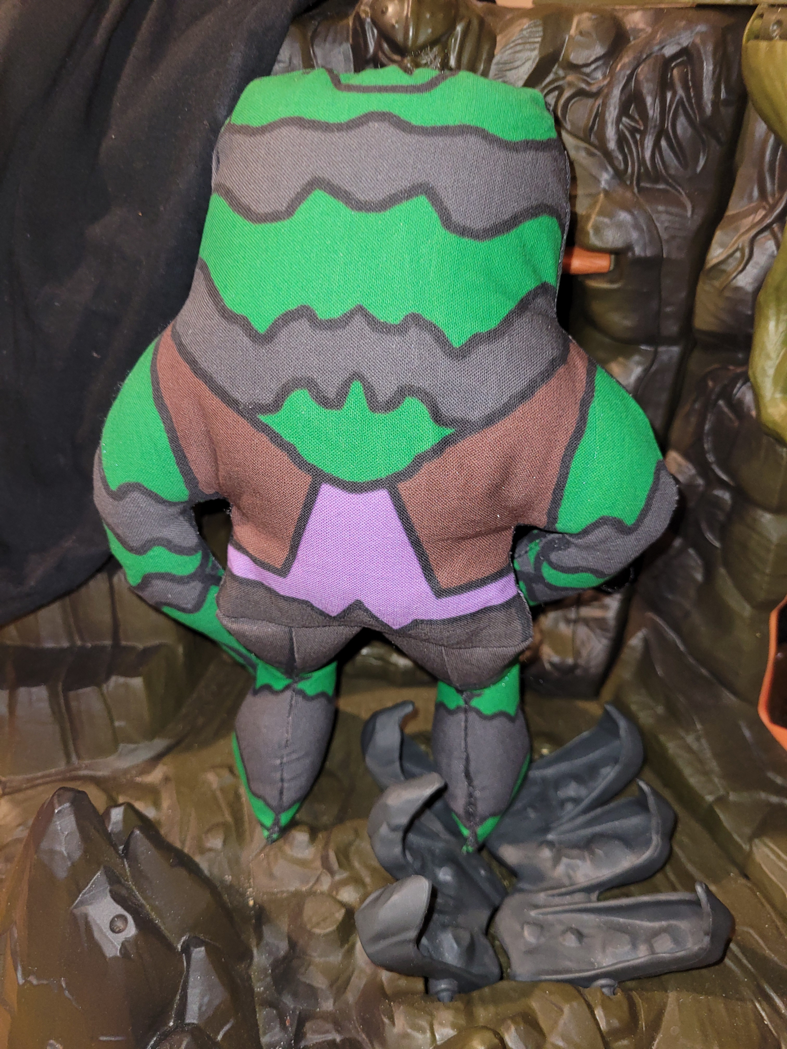 This original Glorker concept was made more like a fabric doll from yesteryear, where the legs are sewn into the seam in a forward facing position. With the legs posed the way they are, a fun side effect is the Glorker can stand up pretty well on it's own, glaring down on smaller toys.